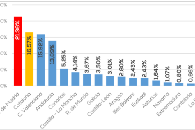La siguiente gráfica recoge el aporte de cada Comunidad autónoma a los nuevos afiliados a la seguridad social en el último año.